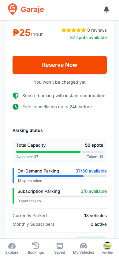 Garaje shows transparent pricing for every partner lot. Clear hourly & daily rates, options for cheaper lots, no hidden fees. You pick the lot that fits your budget before you start driving.