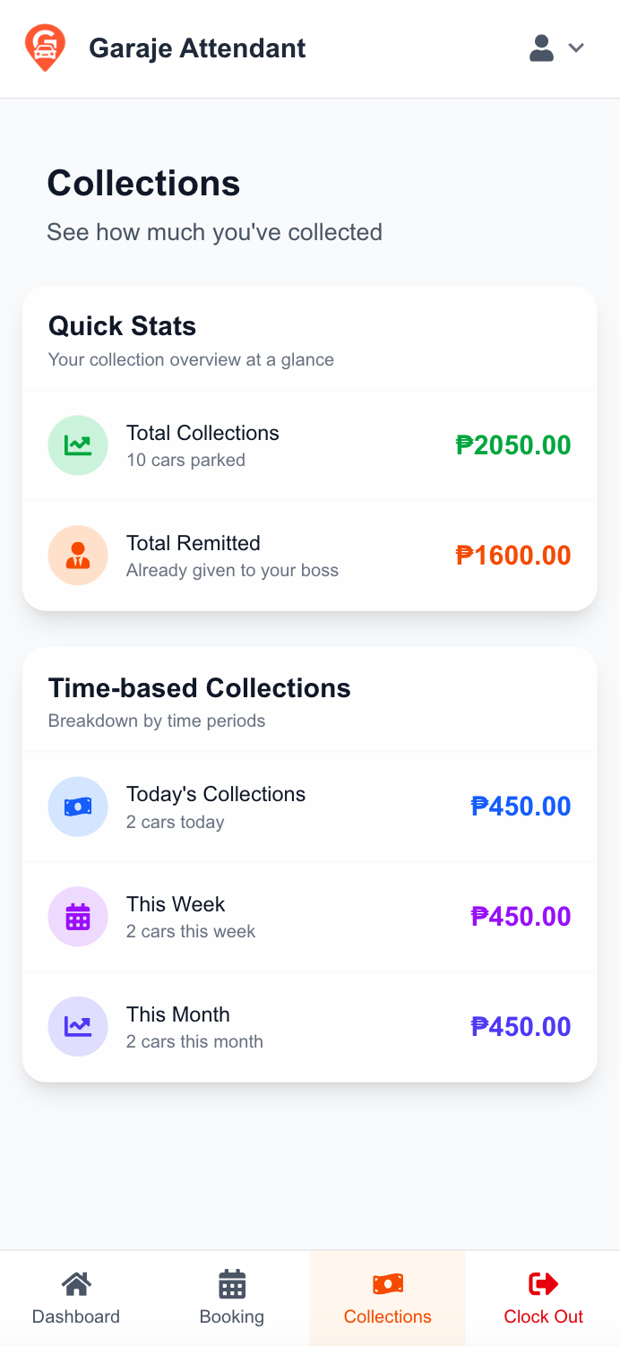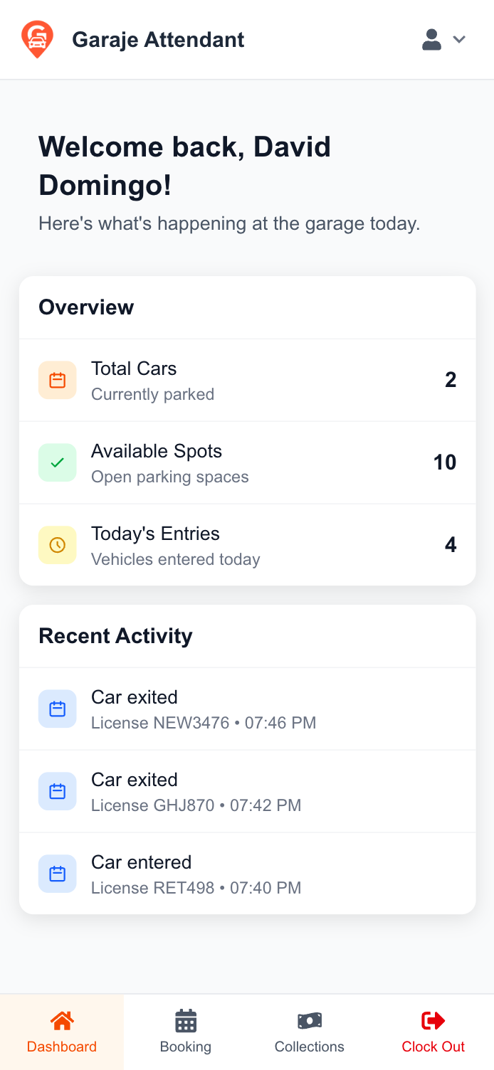 View parking capacity (available/occupied spots). Today's entries count. Recent bookings list. Location-specific data access.