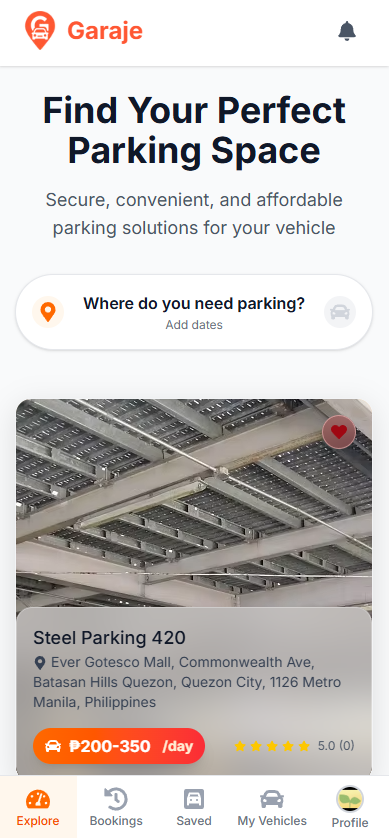 Location-based search with interactive map view. Real-time availability display. Filter by capacity and location. Detailed parking listings with photos, address, and ratings.