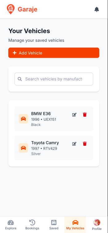 Save multiple vehicles to your profile. Quick booking with saved vehicle information. Vehicle profile management (manufacturer, model, year, plate number).