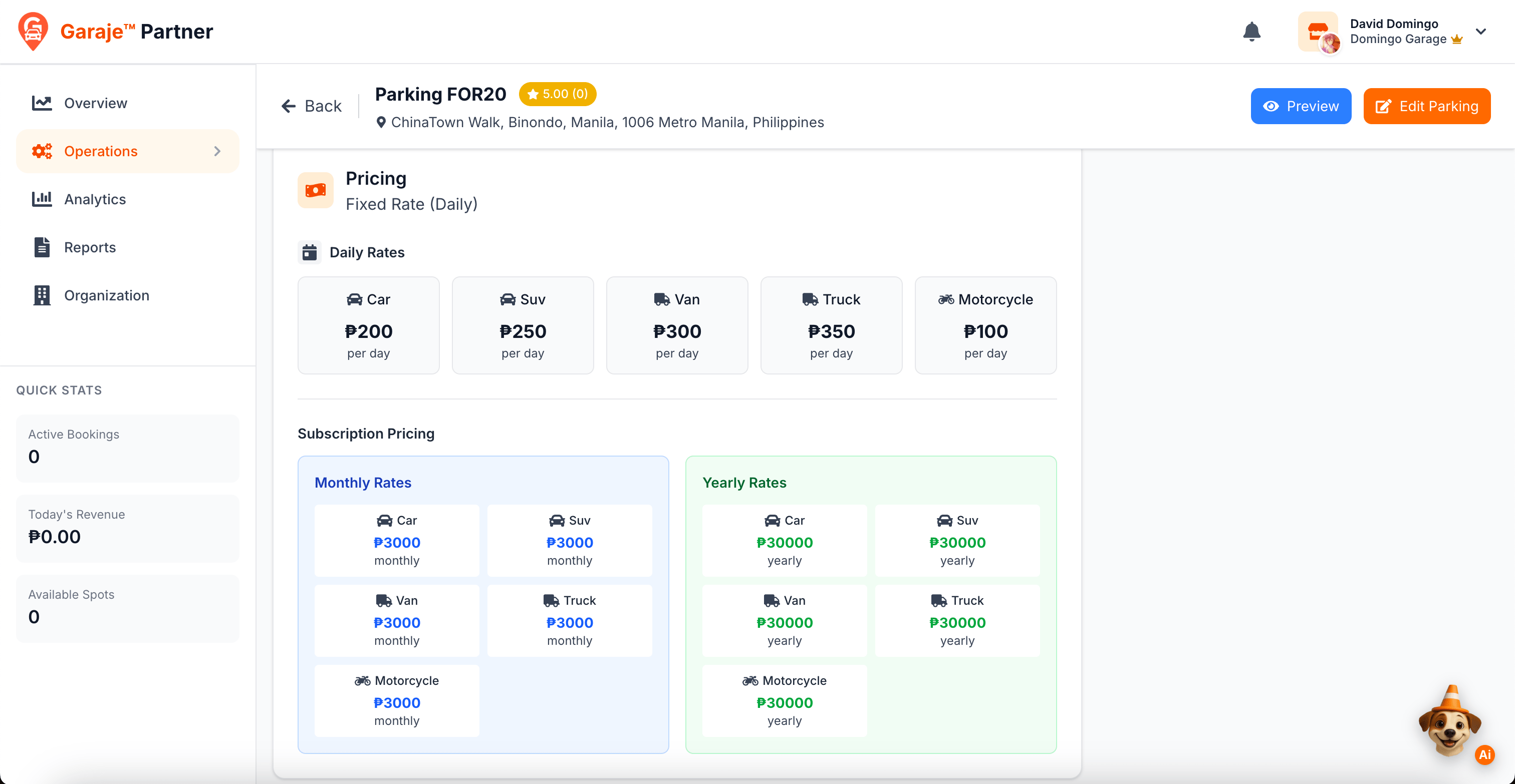 Choose pricing plan: Fixed rate (daily) or hourly rate. Vehicle-specific pricing for all vehicle types. First hours fixed pricing option (for hourly rates). Monthly and yearly subscription pricing setup.